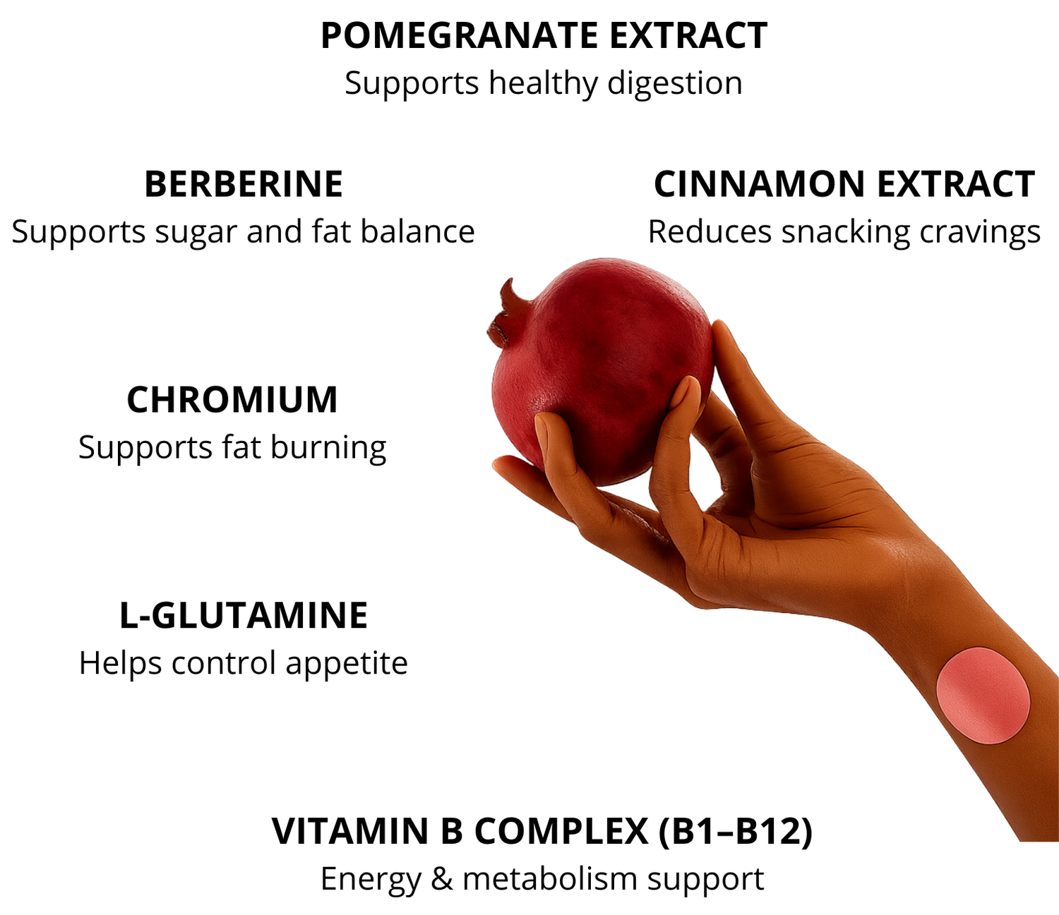 Berberine Extract 8.75mg, Pomegranate Extract 1.75mg, Cinnamon Extract 2.75mg, Vitamin B Complex: Thiamine (B1), Riboflavin (B2), Niacin (B3), Pyridoxine HCl (B6), Folate (B9), Methylcobalamin (B12) 8.25mg, L-Glutamine 3.5mg, Chromium 35mcg